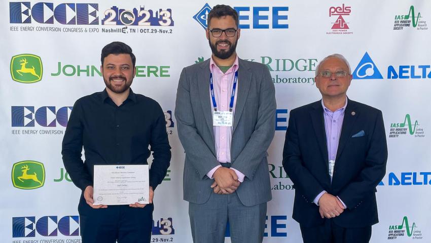 Power and Energy Institute of Kentucky (PEIK) and SPARK Lab researchers received from the IEEE Industry Applications Society Electric Machines Committee (EMC) the Energy Conversion Congress and Exposition (ECCE) Second Prize Paper Award for the article: “Winding Losses in Coreless Axial Flux PM Machines with Wave and Spiral PCB Stator Topologies”, which was presented and published at the 2022 ECCE edition. The main author, Yaser Chulaee, PhD student, is shown on the left in the photo taken after the awards ceremony during this year‘s ECCE edition, together with co-authors Donovin D. Lewis, PhD student, and Dr. Dan M., Ionel, PhD advisor, ECE Professor, L Stanley Pigman Chair in Power, SPARK and PEIK Director.
